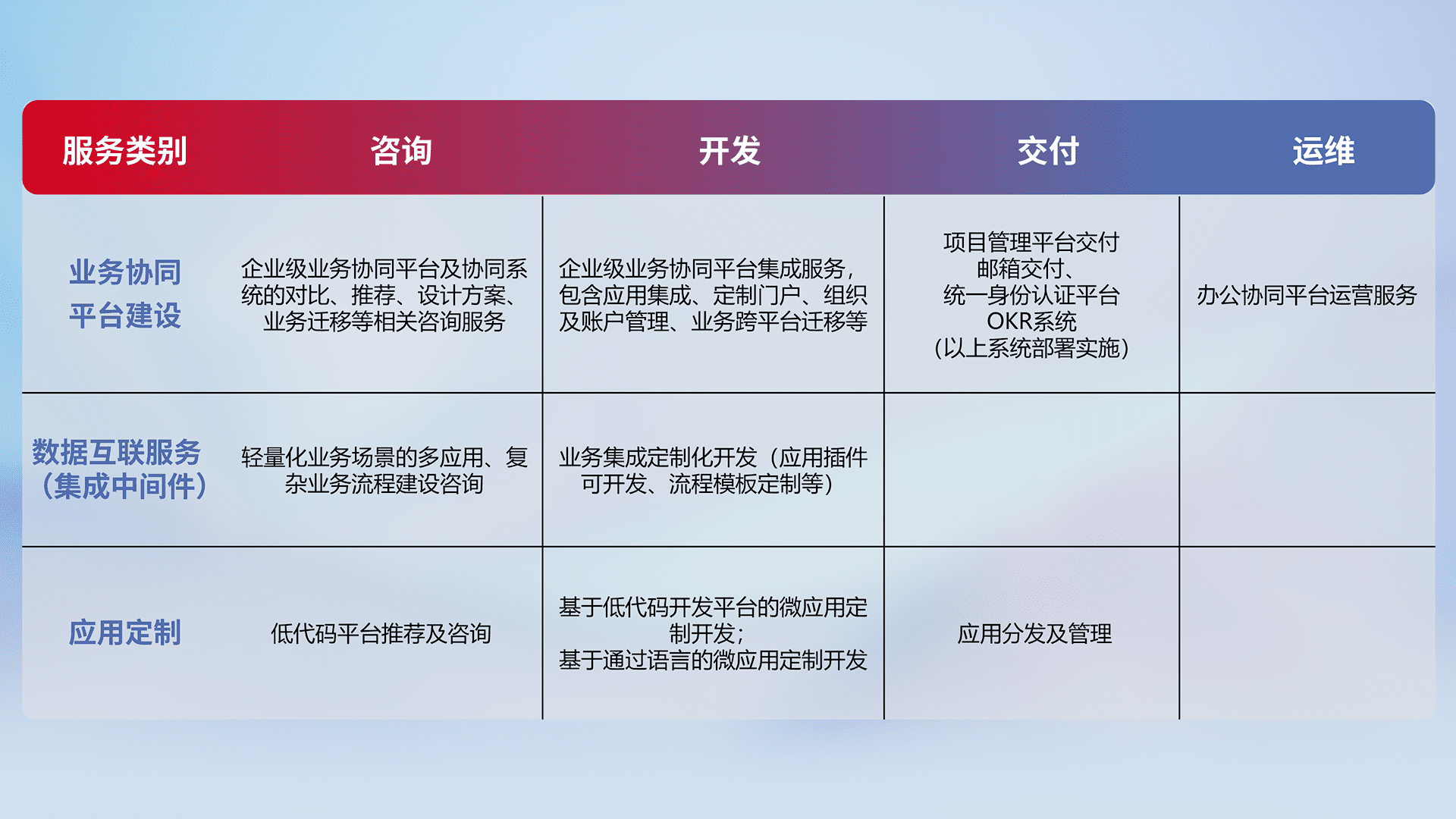 针对钉钉、、企微、、、、IDaas等平台级产品提供产品的规划、、方案、、交付、、、、定制化开发等服务,,,,实现如统一协同办公、、、智能客户服务、、、、混合会议管理、、、、智能数据查询、、等业务场景,,实现数字化转型。。。。